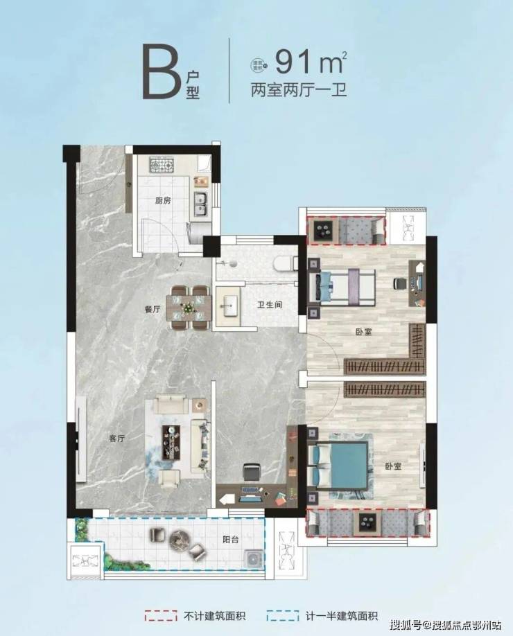 阳光·四季襄郡目前推出的为建面约91㎡两室两厅一卫,整体户型方正,拥有较大的横厅面积。