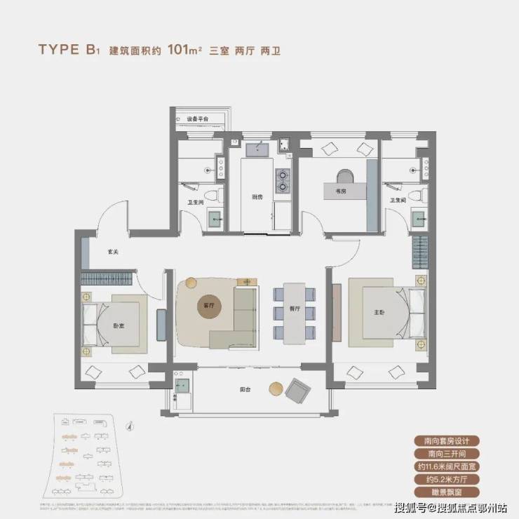 建面约101㎡三室两厅两卫:5.2米面宽横厅设计,LDK一体化布局,空间通透感极强。连接大尺度观景阳台,采光通风俱佳;主卧大套房带飘窗,尊崇感十足,可满足三口之家的多元生活需求;