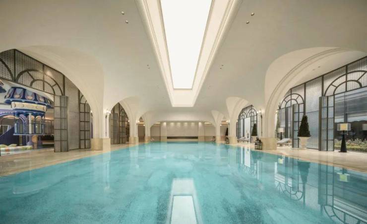 地下恒温泳池三面采光,顶部是15米玻璃天顶倒映着空中花园水景,泳池底部300万片马赛克拼出名画《睡莲》局部。