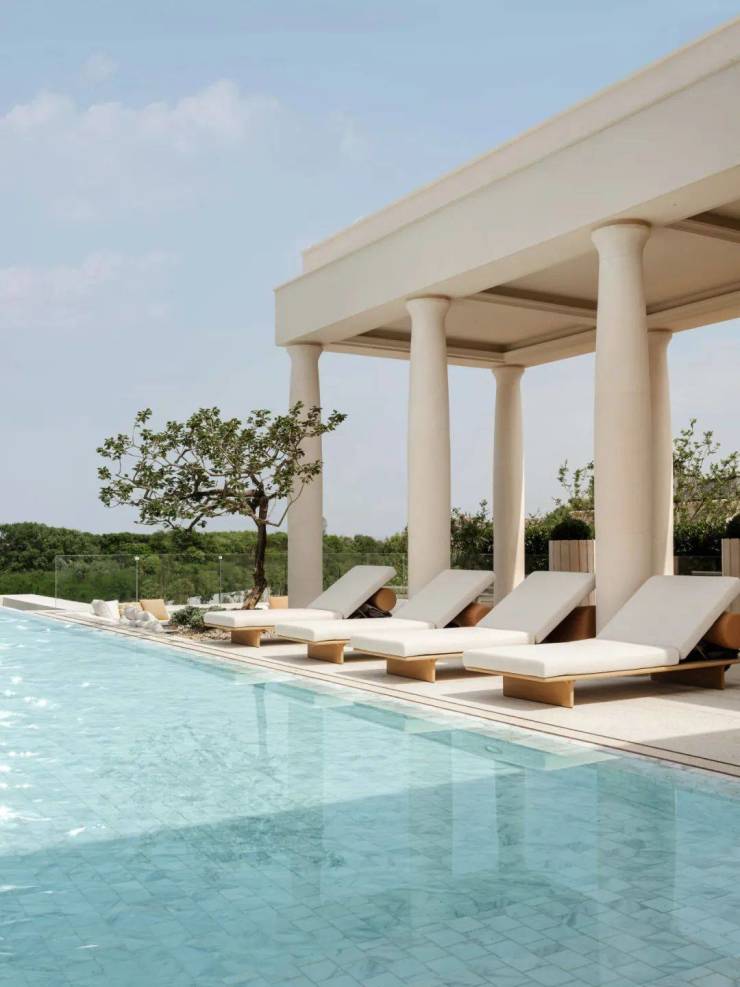 三楼景观瞭望台设置悬挑9米的无边镜面水池,被法式浪漫的柱廊环抱;向南望去,群山连绵,天际线高低起伏,美不胜收。每到傍晚,太阳回到这里,带来满池的霞光,让人忘却烦恼,沉醉于这份恒久的美丽之中。