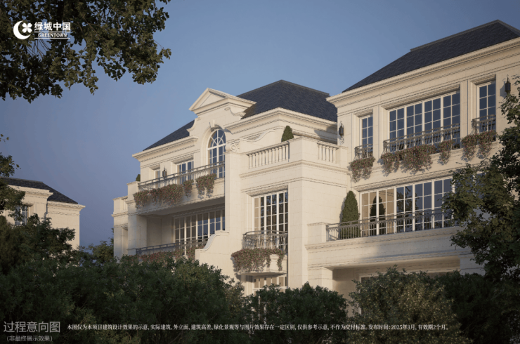 项目以香奈儿老佛爷摩洛哥南法海岛别墅为灵感,在设计上沿袭法式建筑的经典型制,并融入当代审美,规划更大窗墙比、定制建筑立面等,造诣契合当下居住体验的同时,迭新绿城法式的浪漫表情。