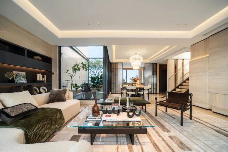 下叠空间则以另一种语言诠释着生活的温度——在这里,庭院与室内的边界被温柔消弭,高定沙发正静静等待归人,大理石餐桌上凝固着月光般的雕花。这些器物会记住生日蛋糕的甜,也包容深夜归来的苦——整装交付的不仅是家具,更是未来生活的全部脚本。