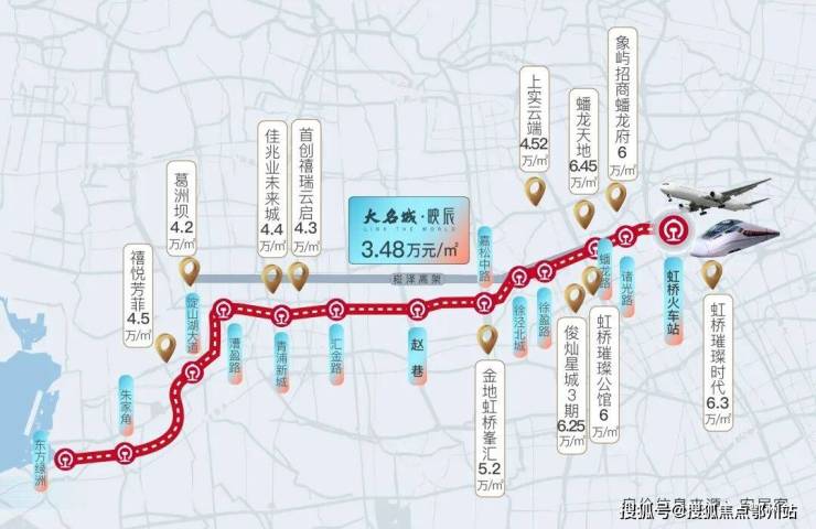 其次,对比大虹桥,大虹桥新房普遍6万+/平方米,二手房则更是突破9万/平方米(如蟠龙天地、万科天空之城等),而车行时间相距仅约15分钟的大名城·映辰仅3.48万/平方米,价差明显,相当于新房的58折,二手房38折。