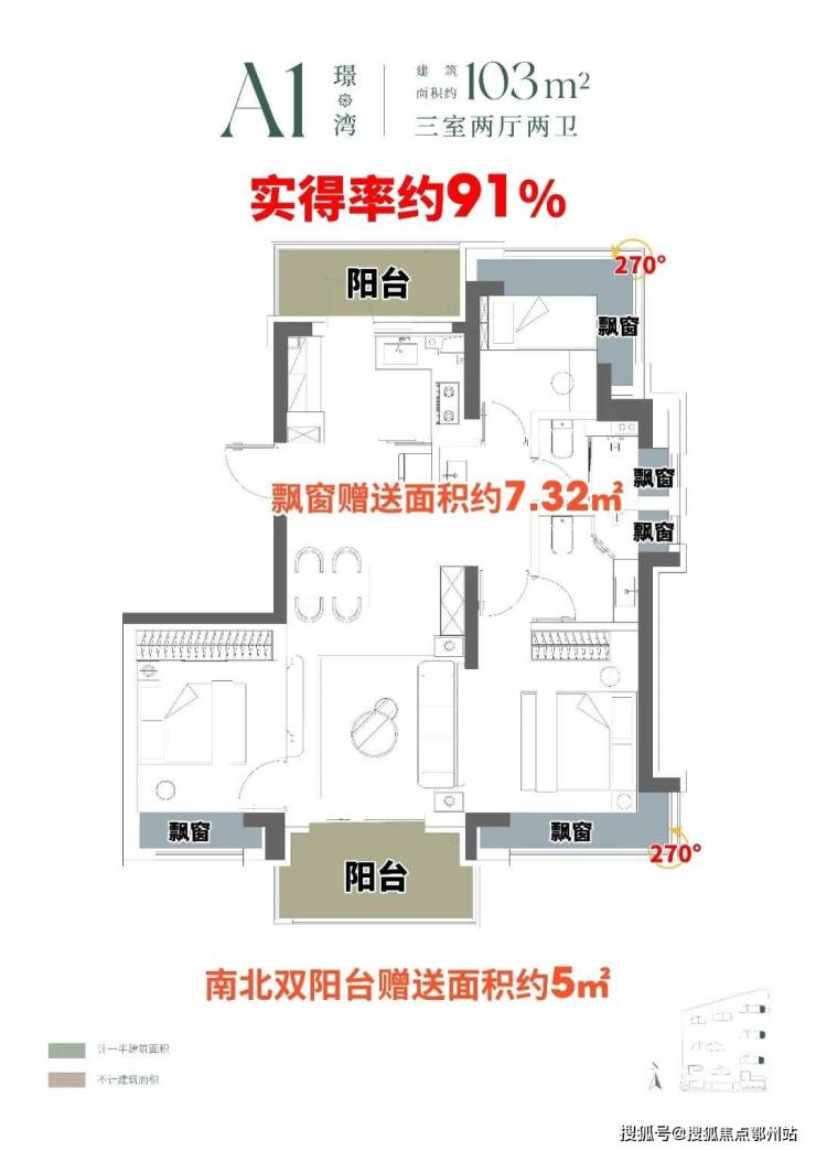 建面约103㎡A1户型,约10.47㎡南北双阳台空间,阳台“买1赠1”,赠送约5㎡,南侧观景阳台,北侧功能阳台,更附赠约7.32㎡飘窗,实得率约91%。