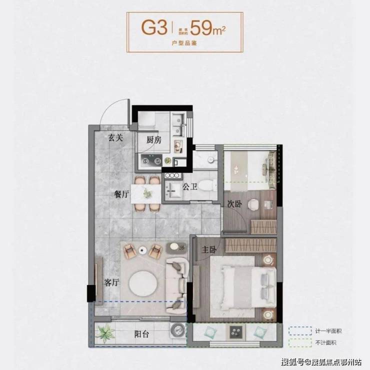 从户型图来看,这个59方还算方正,两室一厅一厨一卫,基本功能完善,但也存在不少硬伤, 比如客厅朝北,采光肯定不会好。 相比之下,在临安,某个楼盘的59方户型设计稍微实用些,相当于把常规三开间朝南的89方减掉一个主卧+主卫。由于是毛坯,阳台包进客厅,实用面积提升,但餐厅、卫生间的面积都捉襟见肘。