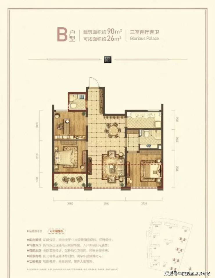 作为板块内近几年交付的小区, 得力名望府赶上了测绘新政前 ,譬如本次介绍的这一套建筑面积约 89㎡ 的二手房,其三房两厅两卫的“老户型”,有了堪比目前市场上建筑面积约120㎡的户型居住尺度。