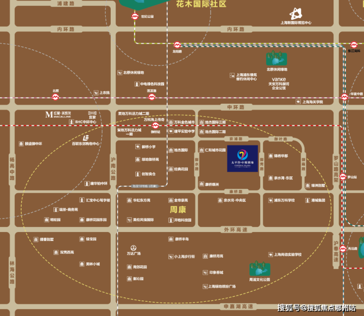 山绿洲等20多个大中型高端小区,近4万多户人家,约15万人口;而且项目东面的康桥E-one创业园,西边的复地万科活力城一二期,BHC中环中心,汇宝中心等高端办公集群,也为项目后期运营提供了大量的商务人群。