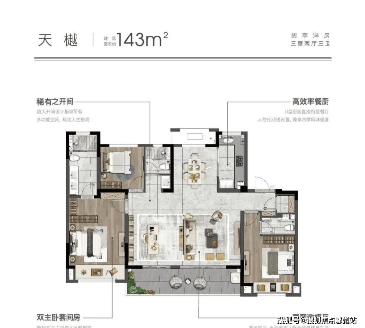 成为全家生活的欢乐场; 双主卧套房 带来尊崇私域化空间体验, 独立卫浴 ,营造更温馨的起居氛围, 南向宽景飘窗 ,给居者足够明亮的从容空间……
