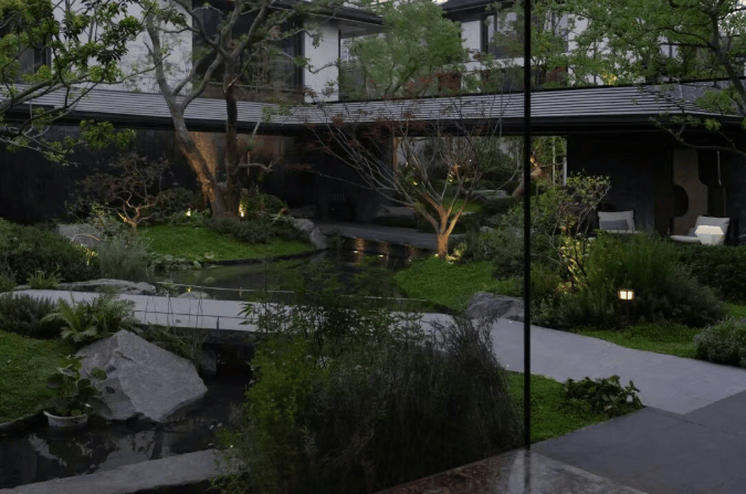 五株黑松以苍劲之姿构成「黑松叠景」,每一株都是跨越山河的生态艺术品,在古朴素简的山水画卷中,感受现代东方下的半隐秘境。