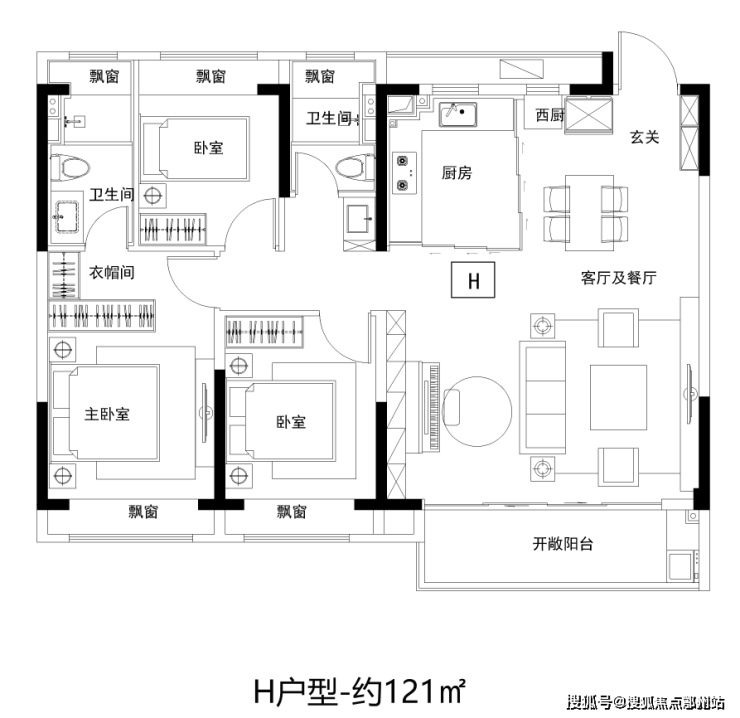 三开间朝南,南北通透,全屋不仅没有空间浪费,阳台和飘窗还带来了较高得房率,实际使用效果不输百平户型。