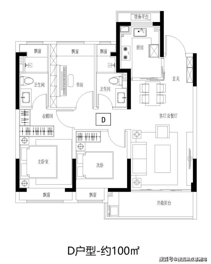 该户型可以说是拥有市面上百平三房的所有亮点,三开间朝南+超大景观阳台+动静分离+主卧套房设计,功能齐全,尺度感和舒适度兼有!非常适合预算400万级的三口、四口之家居住!