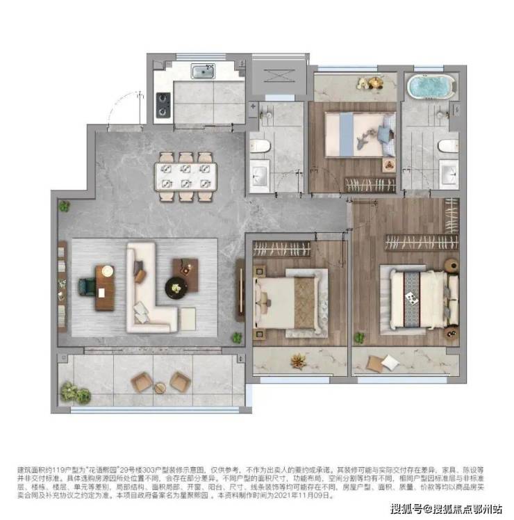 约119㎡ 3室2厅2卫:南向大面宽,约5.9米宽景阳台,通透格局,主卧套房设计。