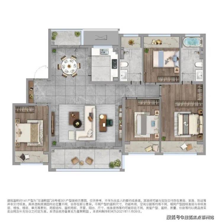 约141㎡ 4室2厅2卫:南向四开间,超大面宽,奢阔四房,满足现代成长型家庭需求。