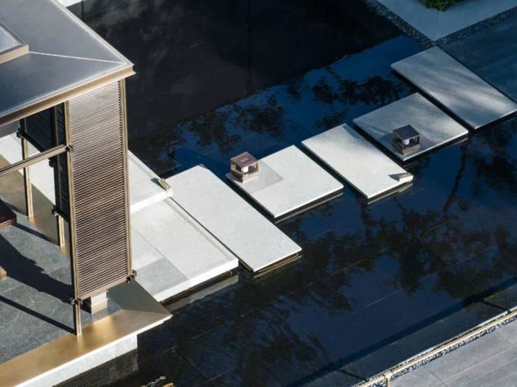 此外,还选用与建筑同等标准的 爱马仕专色大象灰石材,足以体现细节与匠心,景石采用顶级奢石“中国黑老石皮”,千里迢迢空运而来,置于水境空间形成山水交融的意境,更显瑧悦高定奢境匠艺。