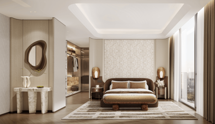 不只是主卧尺度场景优越,卧室系统还采用双套房分区的设计,家人在餐客厅交互,卧室分布两侧。