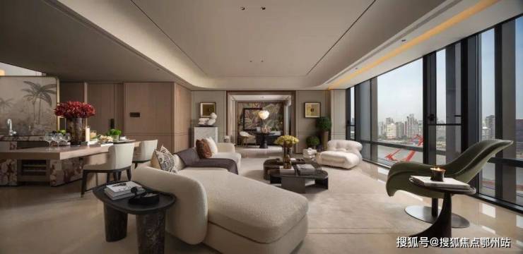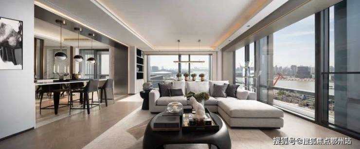 ·建面约240㎡边套,采用L型转角落地窗,打造了 270°环幕瞰江视野,无论身处客厅、餐厅,都能以不同角度眺望黄浦江的波光粼粼
