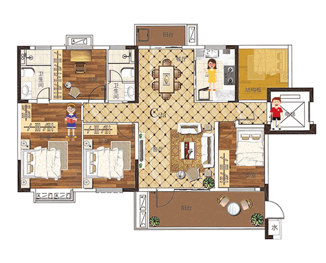 阔绰的四房设计,尊重每一位家庭成员的独立空间。老人们可以在阳台上种花、喝茶、逗逗小孙子;书房是爸爸的地盘,厨房是妈妈的主场;家里每一个角落,都是孩子的游乐场……三代同堂,动静相宜,满足天伦之乐。