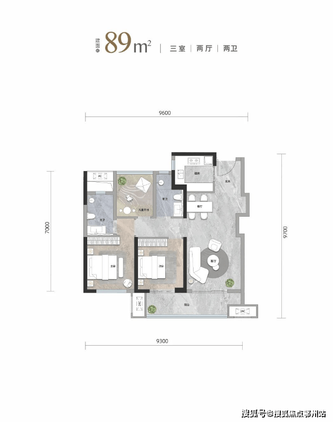 建面约99平户型,打破常规,空间布局设计优化到了极致,赋予其独立电梯厅、通透三房、双卫设计的高配置。