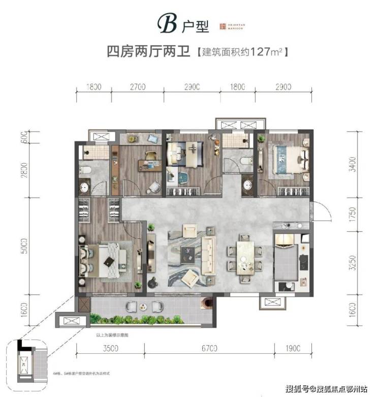 第二个户型为建面约127㎡的阔境四居室,4房2厅1厨2卫南北通透的轩朗户型。