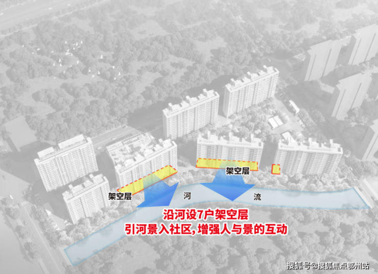 项目南向临河,为了更好发挥水岸优势, 沿河设7户架空层 ,把河景最大程度引入社区。