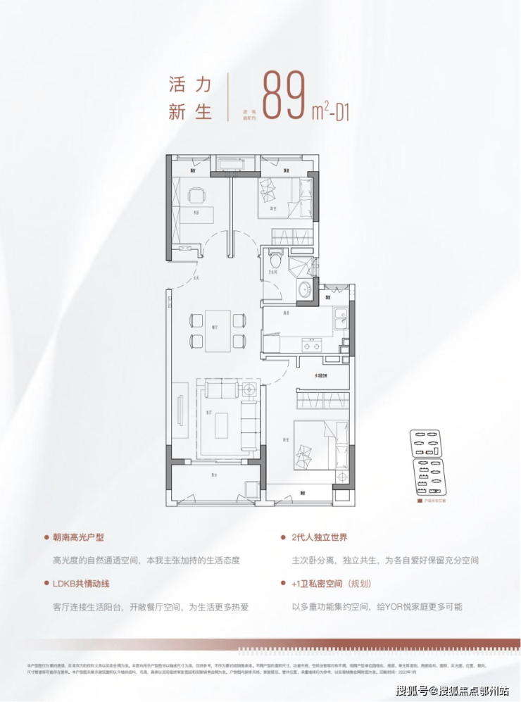 89㎡ 3房2厅2卫(规划)功能户型,入户洗手台规划设计,为业主在疫情常态化的新生活提供更健康的居家生活方式。