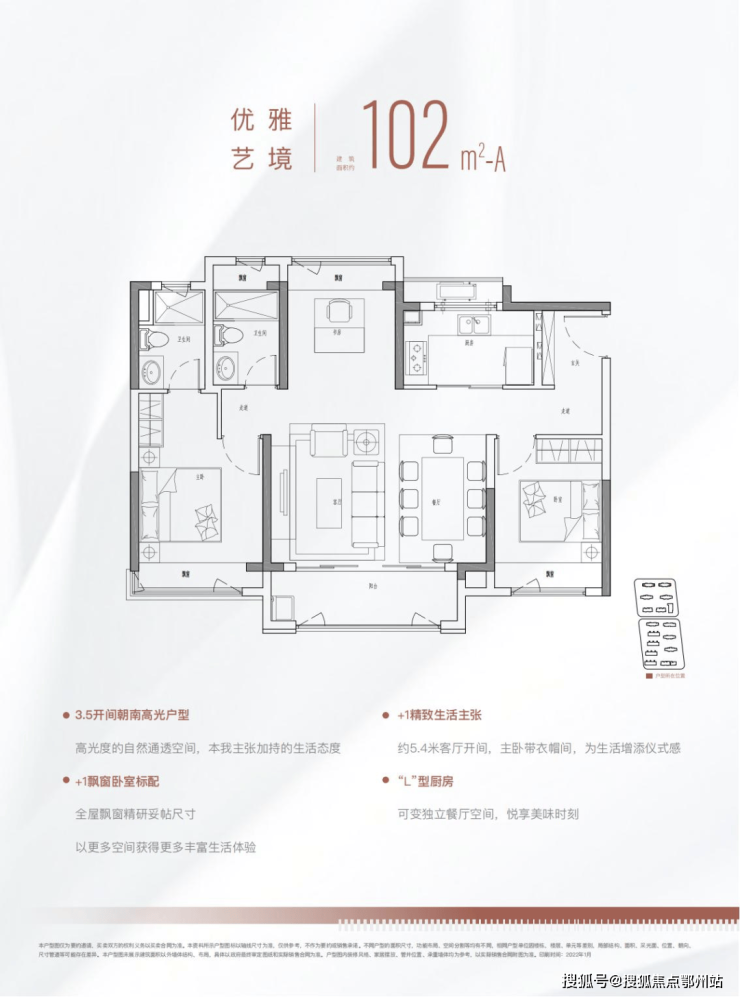 102㎡三房两厅两卫的舒适户型,约5.4m横厅设计,3.5开间朝南,得房率约80%左右(*该得房率仅供参考,最终以开发商官方数据为准) ;每间房均有飘窗,全屋飘窗共享有额外的面积约13㎡(*此处面积仅供参考,最终以开发商官方数据为准) 在市场上也是少有的产品。