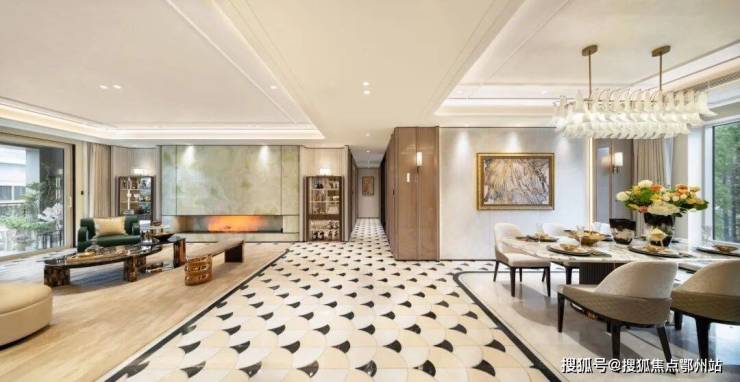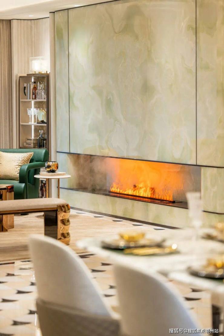 均价3000万的揽奥800同款的风格,电视背景墙采用 揽奥800方同款的青玉 ,地面是 四种奢石水刀拼花 。