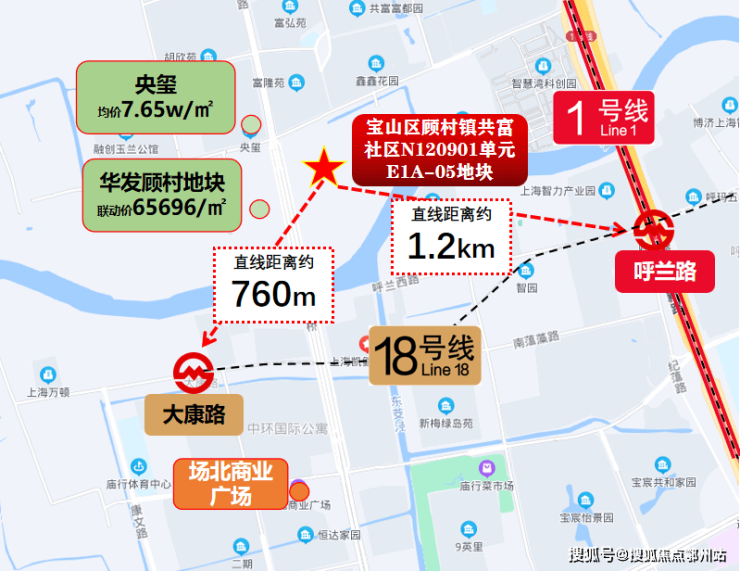 项目地块位于宝山区顾村板块,属于外环内,距离1号线呼兰路站直线约1.2km,18号线二期大康路站(在建)直线约760m。