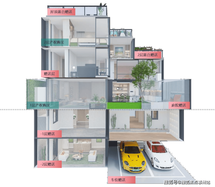 超高得房率, 最高290%赠送率, 户内电梯厅。一楼入户花园庭院、三楼露台花园、顶层屋顶花园,地下室约6米采光井,-1F/-2F可打造茶室、花艺室、健身房、家庭影院、机车室等。