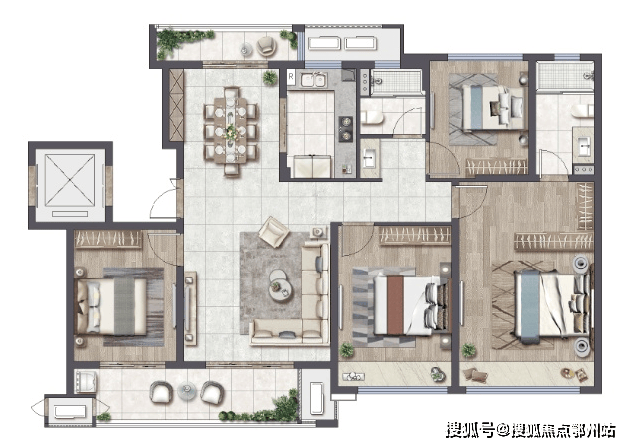 建面约120㎡四叶草户型, 餐客厅一体化+约7米双联阳台,空间通透灵动,三代同堂相伴而居,互不干扰。