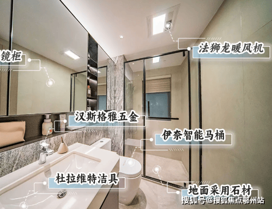 在松湖润府, 配备了汉斯格雅五金、杜拉维特洁具、伊奈智能马桶、法狮龙暖风机,甚至淋浴间地面也采用石材。