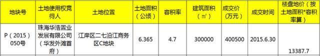 2015年6月30日珠海华发以总价40.05亿元、楼面价13388元/平拿下了位于江岸区二七沿江商务区的P(2015)050号地块