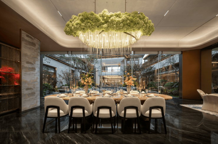 地上庭院呈现“C”型,包裹一体化餐客横厅,约10.35米开间 ,视觉上彰显不凡气度,无论开宴友聚,还是家人日常生活娱乐皆从容。