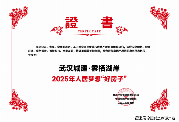 2025年7月4日,由北京中指信息技术研究院主办,中国房地产指数系统、中国物业服务指数系统承办的“中国房地产大数据系列报告会2025上半年市场总结及下半年趋势预判”在杭州召开。在本次会上, 武汉城建·雲栖湖岸凭借“5A好房子”的卓越产品力,从全国百余个入选项目中脱颖而出,荣膺 “2025年人居梦想好房子”的至高殊荣!