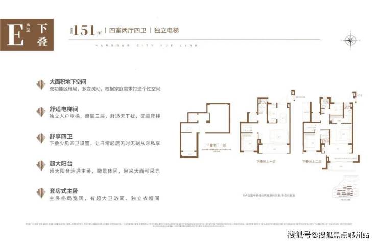 地块中心为20幢4层叠加别墅,共55个单元,总套数约220套。下叠建面约157平,上叠建面约164平。