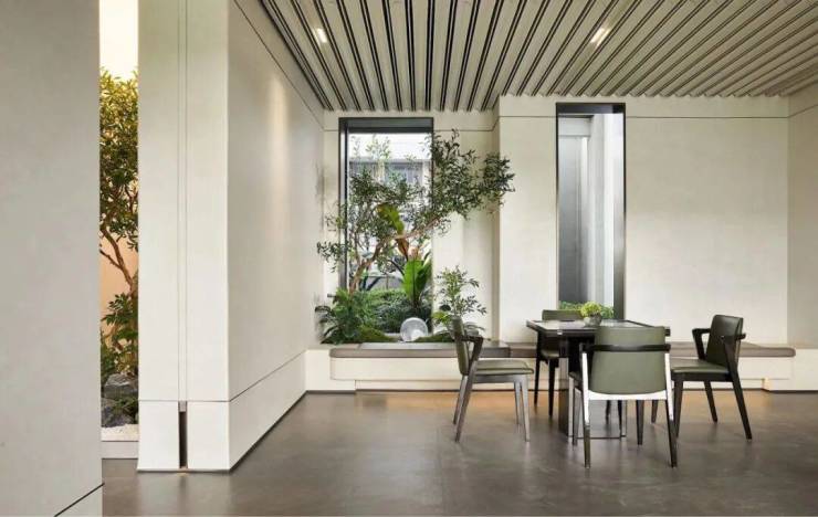 用料上,庭院两侧设计师选用 大理石与镂空铝板 虚实结合,利用2层柏翠造型铝线条错拼而成,更显精致;