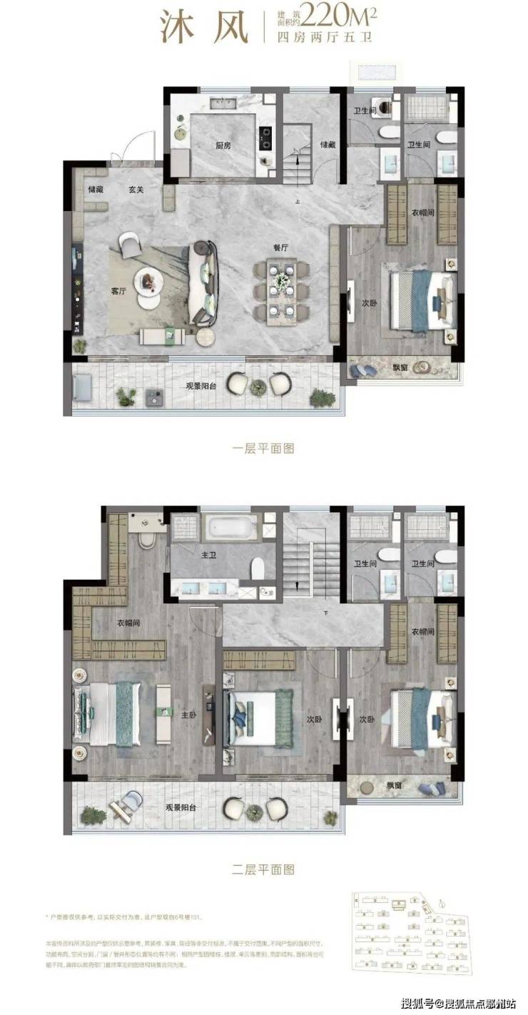户型结构基本都差不多,主要区别在于卫生间的数量,220㎡做到了4房5卫,差不多每个房间都是套房。