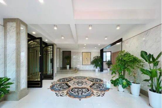 每栋楼都是地上地下双入户大堂的设计,一层入户大堂地面采用了曼陀罗拼花造型,而且都是纯手工切割技术打造的定制款,用材精细讲究。
