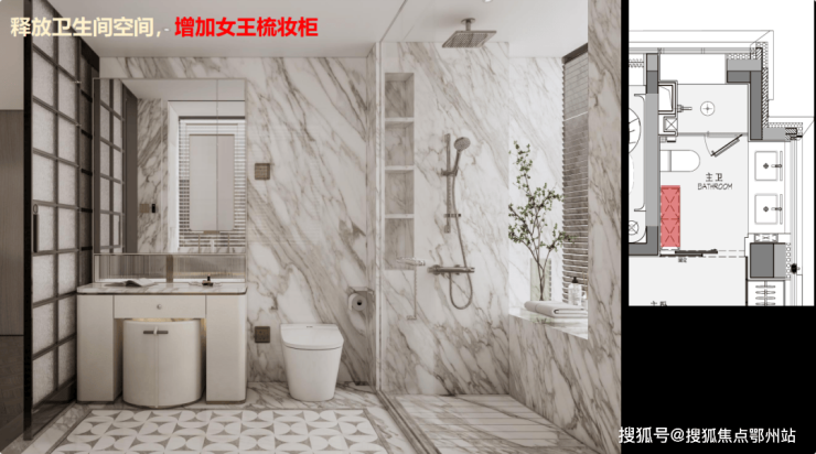 项目特别关注女性家庭生活需求,设置了专属功能空间,如酒店式化妆镜、女王梳妆柜、嵌入镜柜、三面化妆镜、美妆冰箱等,充分考虑女性的审美与生活习惯。创新性地在主卫利用飘窗设置台盆,释放空间打造超级梳妆收纳空间。