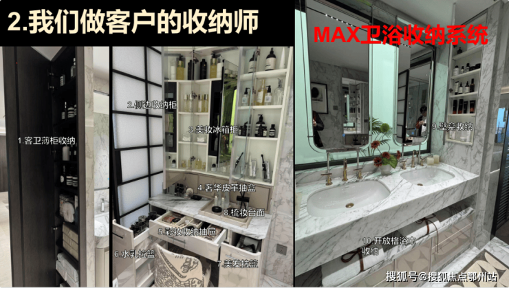 3.卫浴收纳系统:客卫薄柜收纳、侧边收纳柜、奢华皮革抽盒、彩妆收纳抽屉等,提升了卫浴空间的实用性。