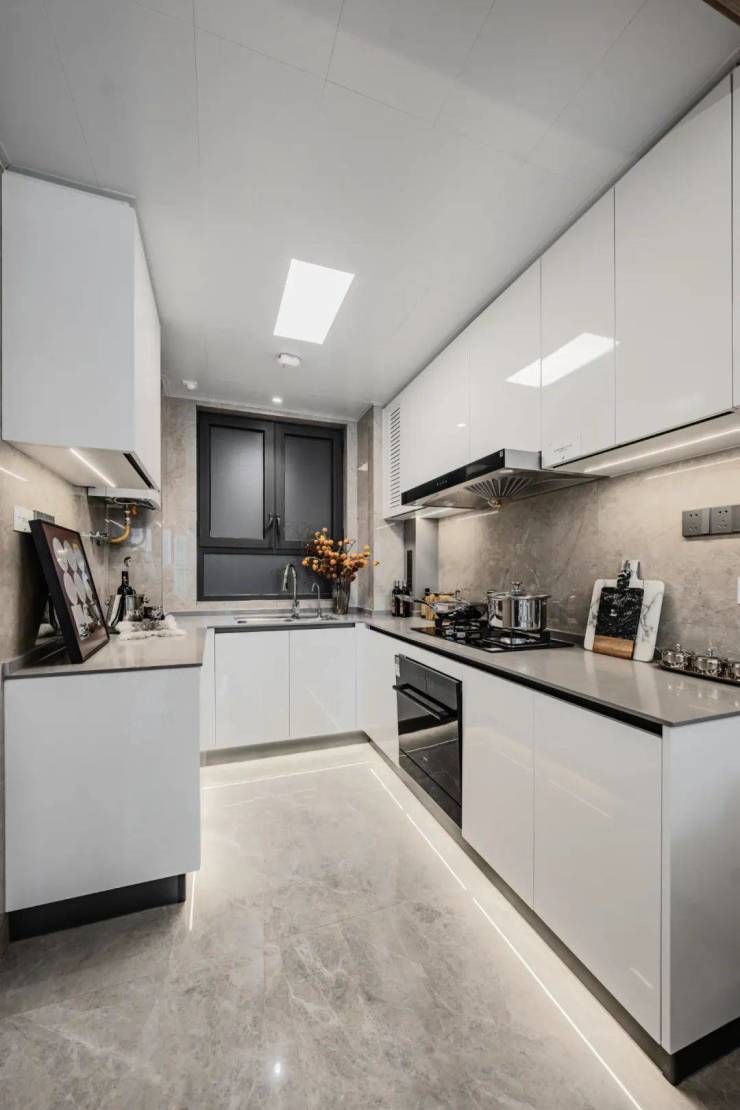 厨房使用科勒(或同等品牌)厨盆、厨盆龙头, 使用起来更加方便;更有定制橱柜、石英石台面,美观耐用的同时也方便日常清洗。厨房墙砖、地砖、吊顶都是统一色调,非常美观。
