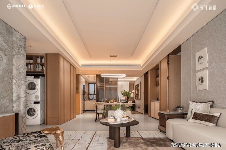2、4大MAX收纳空间:餐厅配备大通顶柜,实现高效收纳;厨房采用U型设计,极致收纳空间包括天使拉篮(顶部反光板)、多功能墙面收纳及墙面调味篮,并配置家政柜,卫生间提供个性化收纳方案。