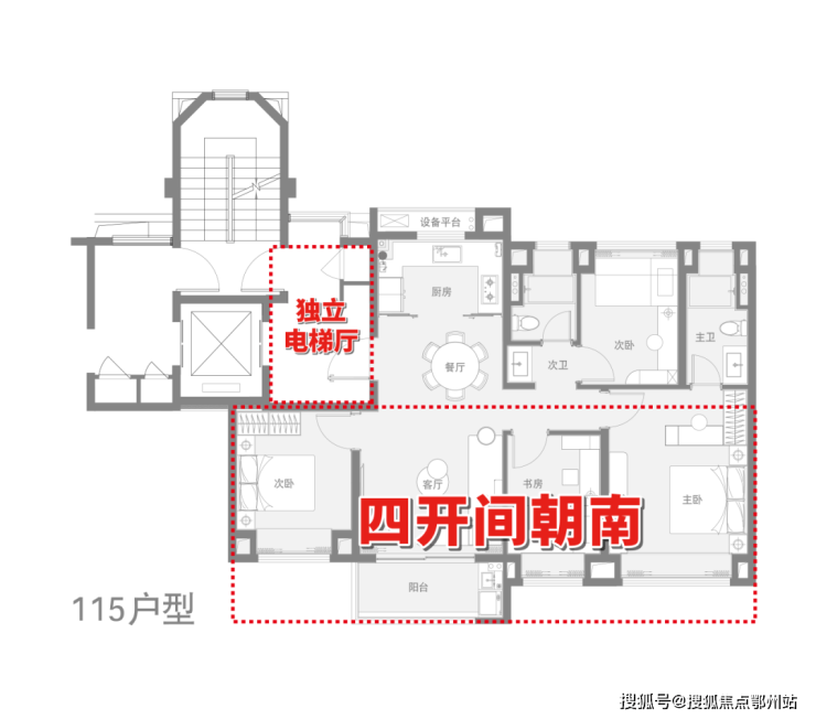 建面约115㎡4房做到同面积段罕见的 四开间朝南+4房设计 ,同时能以更经济的总价一步到位4房。