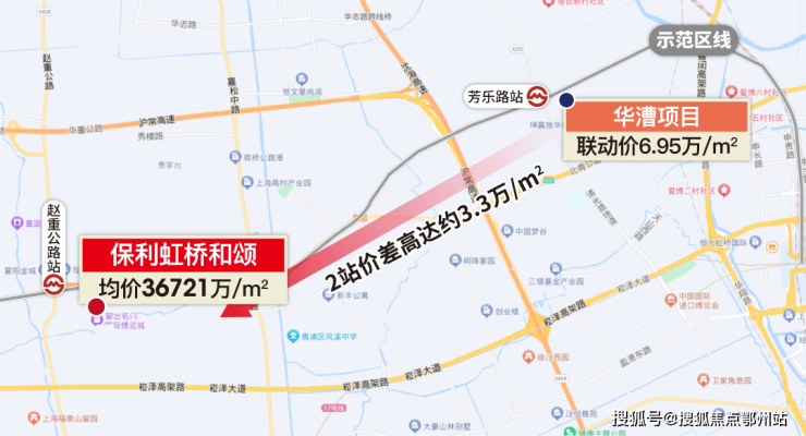 一方面,沿着示范区线2站外的华漕已 6.95万/㎡ ,1站外的华新 4.75万/㎡ ,这样的差价在全市都极为少有。