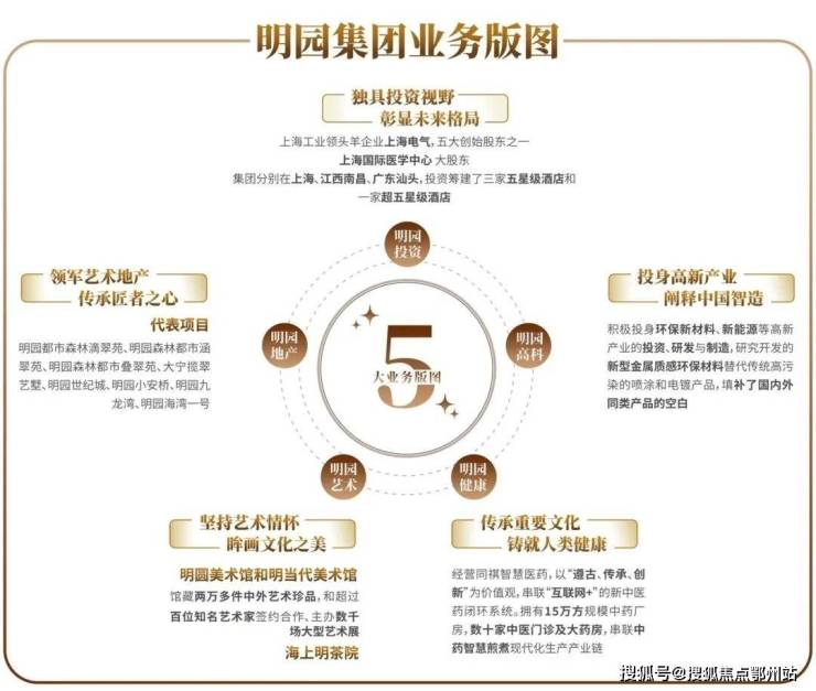 明园地产、明园投资、明园艺术、明园健康、明园高科五大业务版图