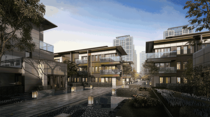 联排区以中 式气韵凝聚的东方禅韵风格为主,建设了艺术轻奢的社区。主要设置有中轴礼仪、街巷主题空间。中轴礼仪花园设置有三重礼仪结构, 从前场、会客厅、后场的仪式序列,给住户提供归家礼仪的感受,同时在归家街巷空间,设置了观棠巷、丹桂巷,兰若巷,樱霞巷主题 空间,做为归家巷道的标识体验。