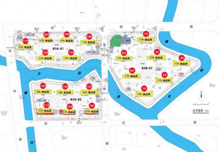共20幢楼、16-17层的高层、标准层高约3米、架空层(约3.5米-4米)