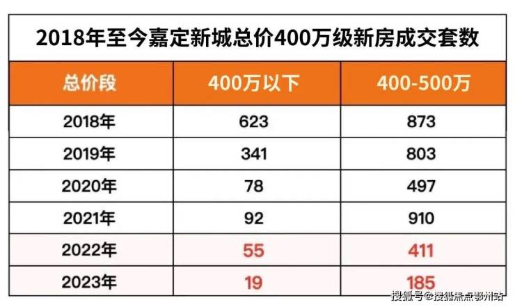 据数据统计,2022年嘉定新城有466套新房成交价在400万级,但2023年就只有204套新房总价在400万级。