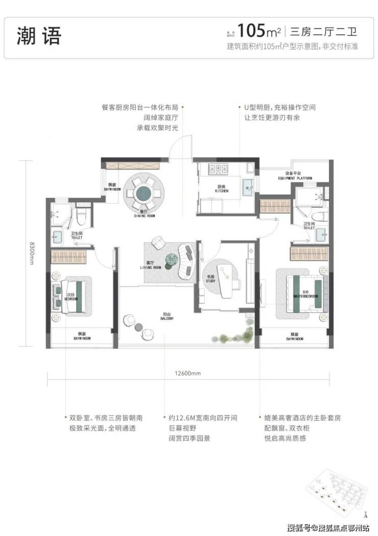 首先,项目的户型起步就是 四开间朝南的建面约105方三房 :