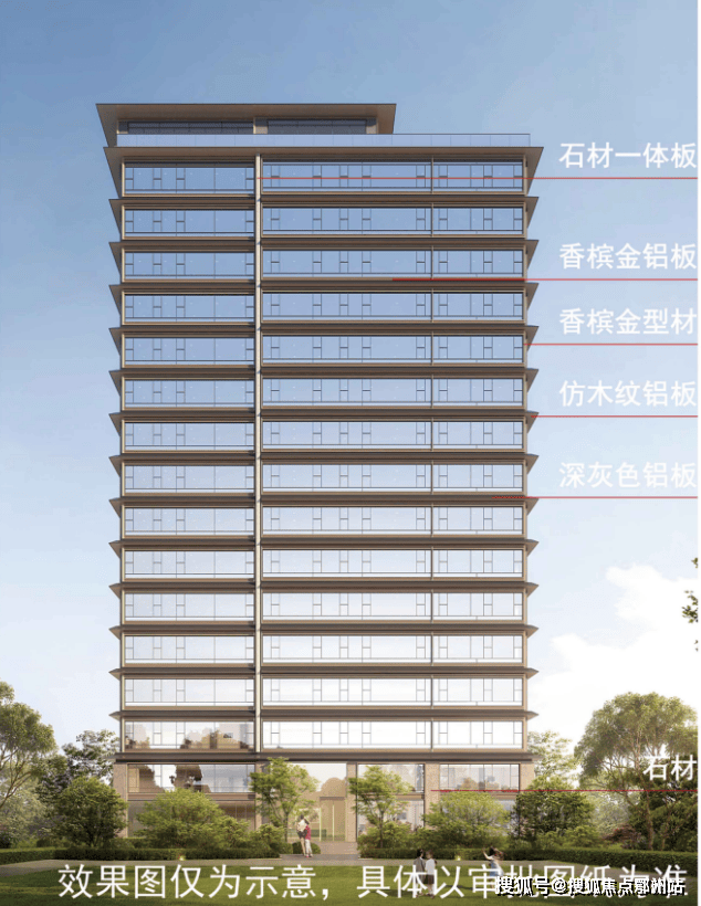 其中, 小高层外立面采用全铝板、石材、石材一体板搭配南向大面积玻璃幕墙;